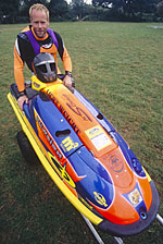 Name: Marc "The Shark" Sickerling Hometown: Bergneustadt, Deutschland Birthday: 10. Dezember 1970 Height: 1,80 m Weight: 77 kg Jet-Ski: Yamaha Superjet Jet-Ski seit wann: 1985 Discipline: Freestyle und Waveriding Sponsors: Big Star, Mormaii und Light Weight Occupation: Fashion Retailer (3 eigene Shops) Hobbies: Skilaufen, Malen, Wasserski (barfuß), Windsurfen, Mountainbiking, Rollerblading, Tauchen Titles: 6 times world champion IJSBA World Finals: 1st Expert Freestyle (1993) 1st Pro Freestyle (1994) 1st Pro Freestyle (1995) World Championship UIM: 1st Freestyle (1996) 1st Freestyle (1997) 1st Freestyle (2002) Entry in the Guinness Book of Records 2001: Marc Sickerling from Germany, who is active in the freestyle discipline, was awarded the European Championship title by the International Jet Ski Boating Association five times (1991-1994 and 1998), the Pro World Champion twice (1994 and 1995) and in 1993 was the Expert World Champion. Furthermore, he was awarded the World Championship title in 1996, the European and World Championship titles in 1997und in 1998 the European Championship title by the Union Internationale Motonautique (UIM). Source: Guinness World Records 2001 Guinness Verlag Founder of the legendary freestyle show team "The Piranha Brothers" |